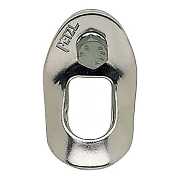 La placca di ancoraggio Petzl Coudee per speleologia mantiene il moschettone in posizione parallela alla parte: permette il passaggio corretto della corda nel moschettone.