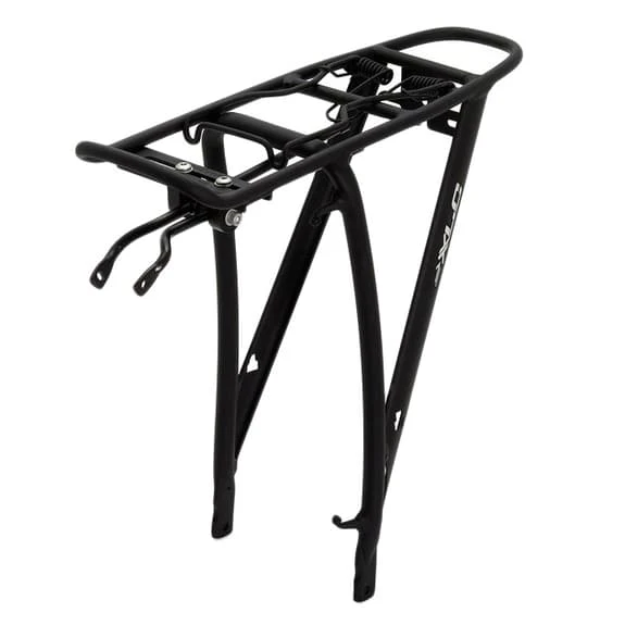 Il portapacchi di alluminio XLC RP-R05 comprende il fissaggio per il telaio della bicicletta, nonché il sostegno per la parte posteriore.
