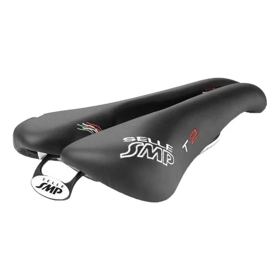 La sella Selle SMP Triathlon T1 è il modello di maggiori dimensioni della gamma di selle da triathlon ed è consigliata per i ciclisti con il bacino largo. È rivestito in vera pelle nelle versioni in colore nero e di microfibra di Lorica per le versioni a colori.