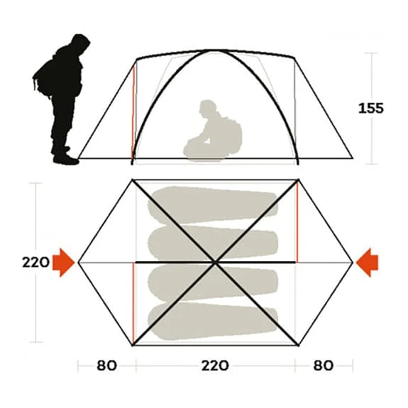 – Materiali: – Doppio tetto in Poliestere Ripstop 70D, 85g/m2, con induzione in poliuretano alluminato termoisolante, impermeabilità 3000 mm, resistente all’acqua, trattato FR